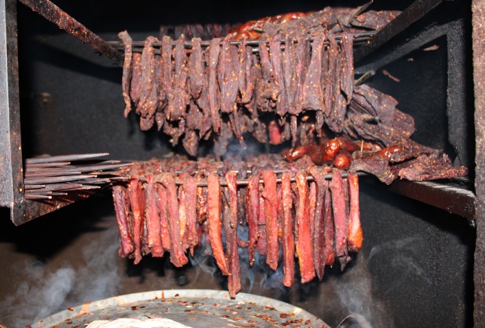 Thịt thái miếng rộng chừng 3 ngón tay, dài tầm một gang tay. Mẹ ướp thịt với muối hột, thảo quả, gừng, mác khén… và rượu trắng. Để một đêm cho thịt ngấm muối, gia vị và bắt đầu lên men (có mùi thơm rất đặc trưng) thì xiên vào que và treo lên gác bếp. Với sức nóng của lửa, của các loại gia vị cay, thịt chín dần. Thịt nạc chuyển sang màu đỏ. Còn thịt mỡ chuyển dần sang trong suốt.